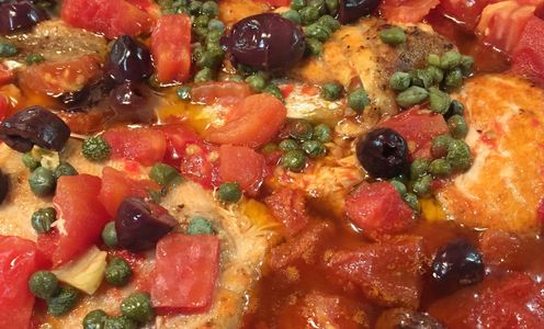 Salmon, Roasted Tomatoes, Garlic, Capers, Olives
